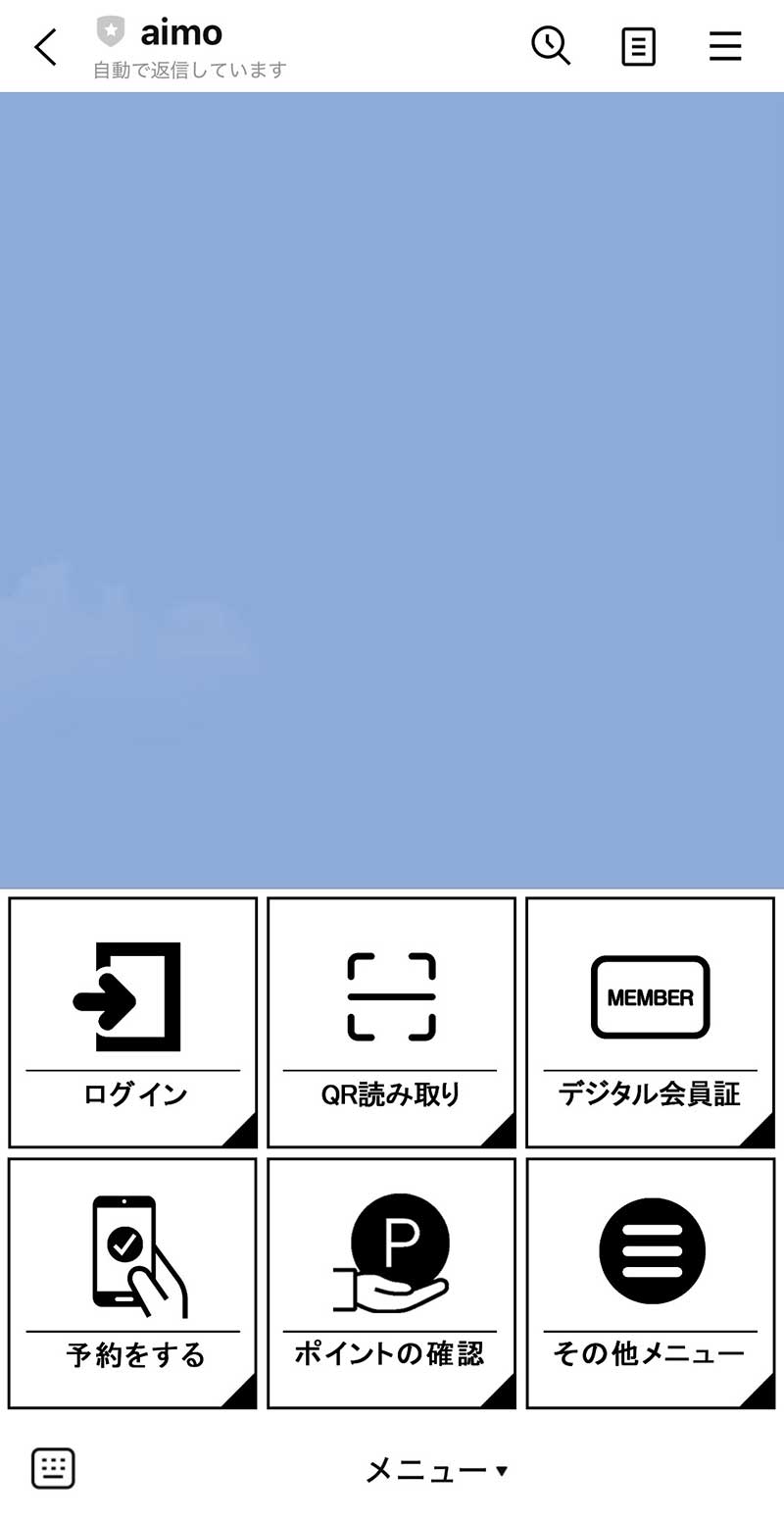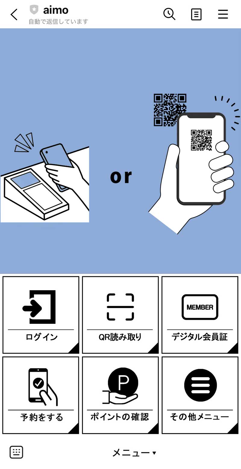 LINE友達登録する → 下部メニューを開き「その他メニュー」を押す → aimoからメッセージが届く(aimo会員登録・予約の確認・aimoの使い方)※横にスクロールしてください → aimoの使い方をクリックする → 登録手順の説明